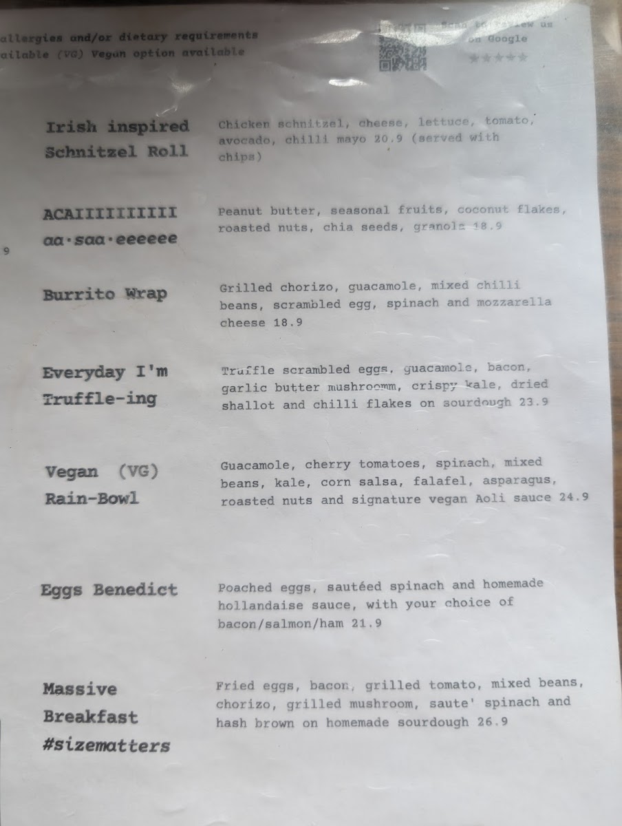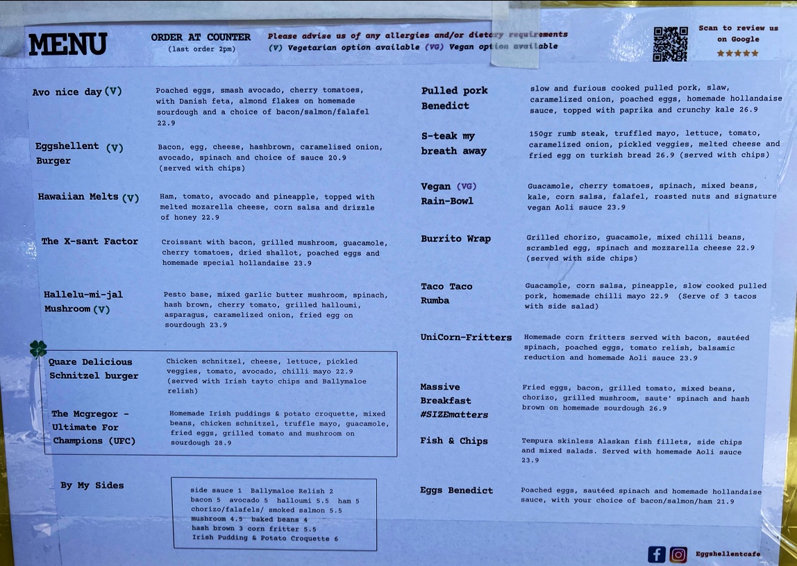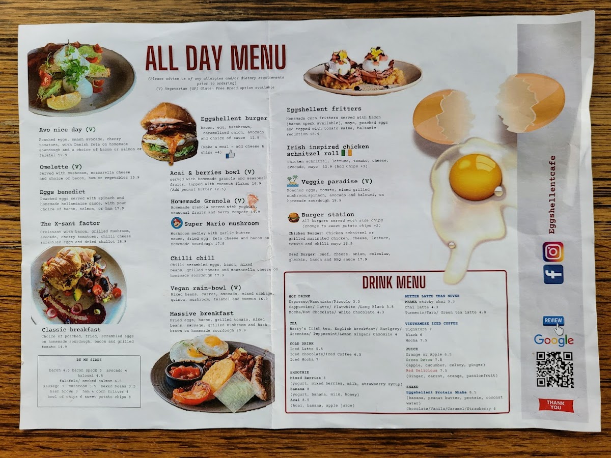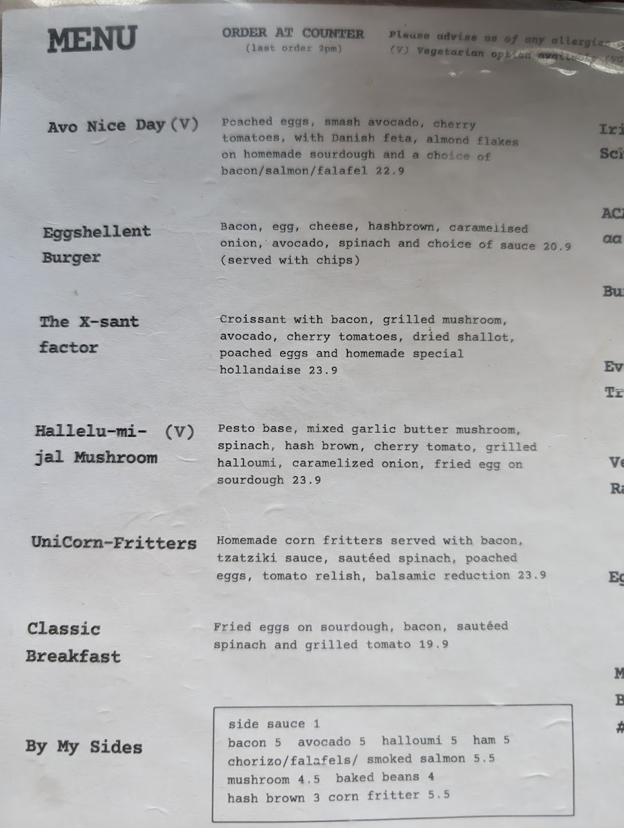 Poached eggs, smashed avocado, cherry tomatoes with Danish feta on homemade sourdough and a choice of bacon or salmon.