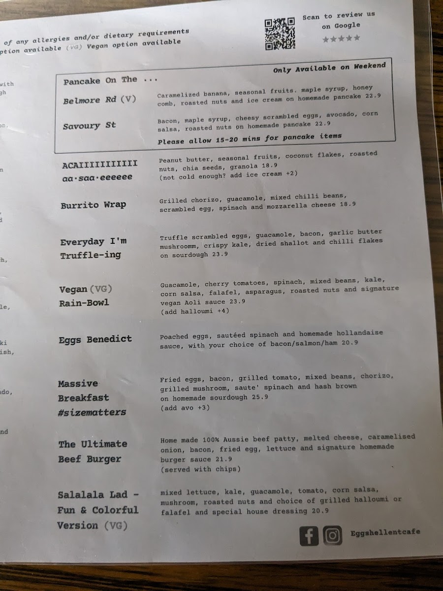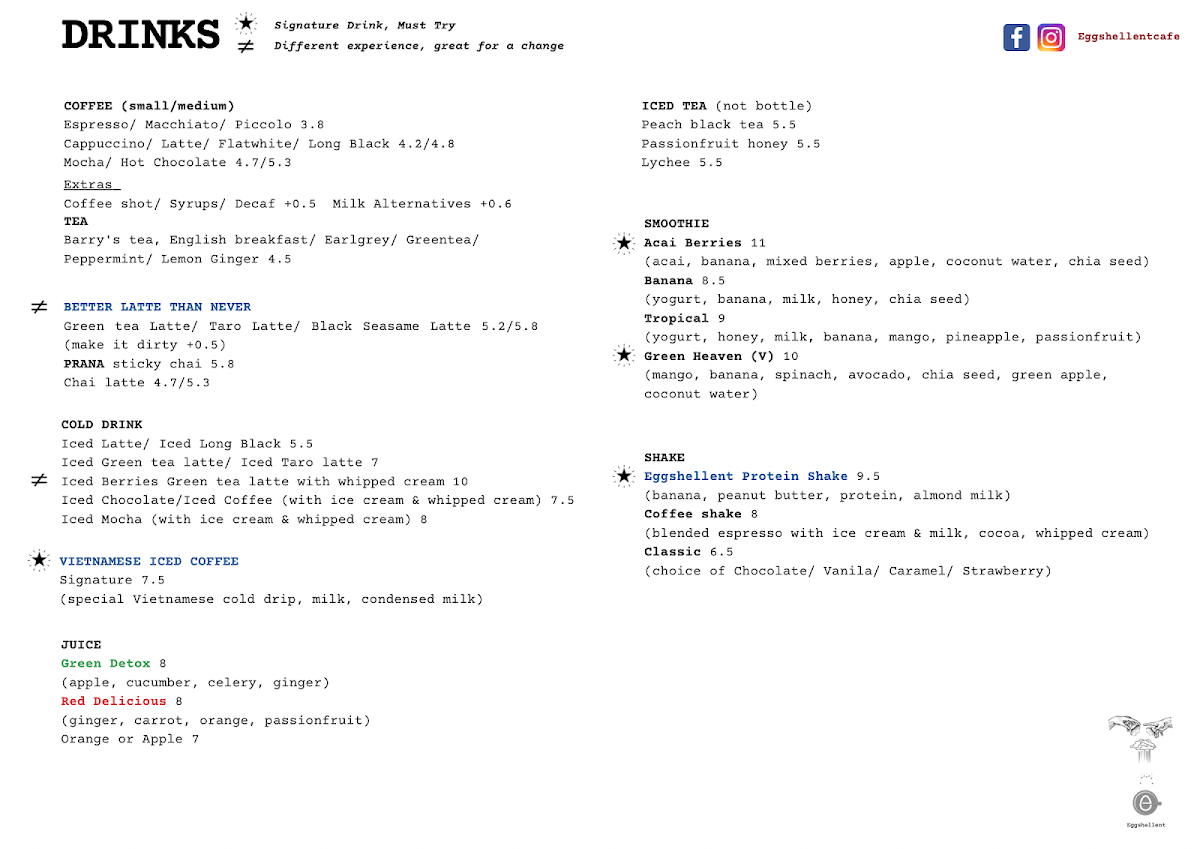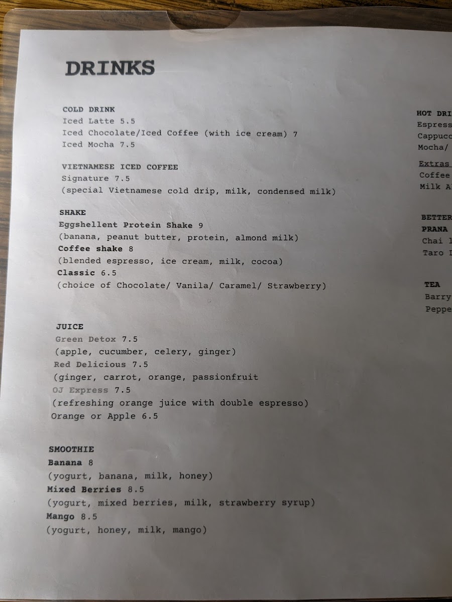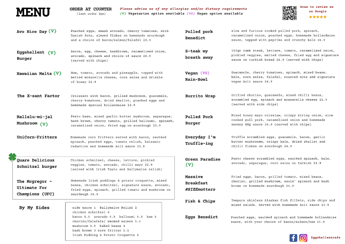 Poached eggs, smashed avocado, cherry tomatoes with Danish feta on homemade sourdough and a choice of bacon or salmon.